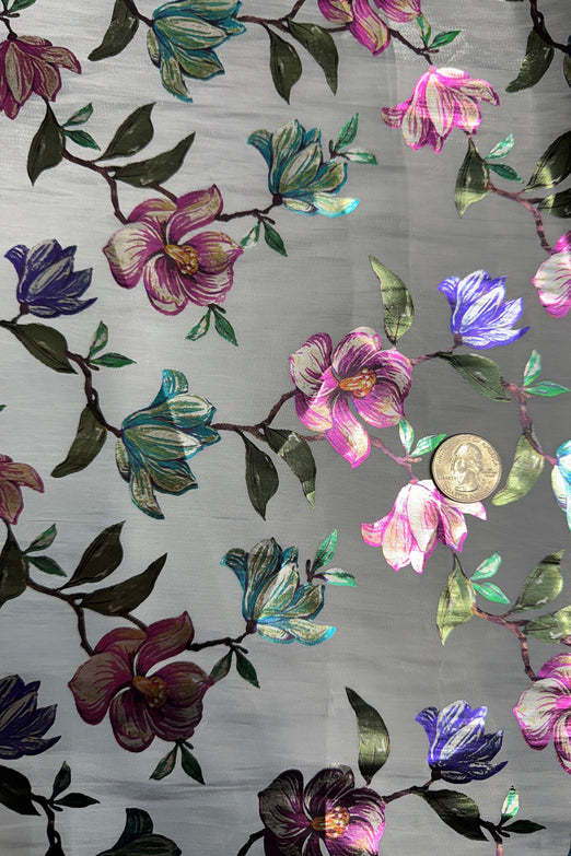 Cool Silver Metallic Floral Foil Print fabrics combine elegance and glamour with their intricate floral patterns enhanced by metallic foil accents. These fabrics feature a smooth or textured base, with the foil print adding a luminous, reflective quality that catches the light beautifully. Perfect for special occasions, they are widely used in designing evening wear, bridal attire, and statement accessories. The blend of delicate floral motifs and bold metallic finishes creates a striking balance, adding sophistication and charm to any project. Available in a variety of color combinations, these fabrics offer versatility for fashion, décor, and craft applications, ensuring a luxurious, eye-catching result.